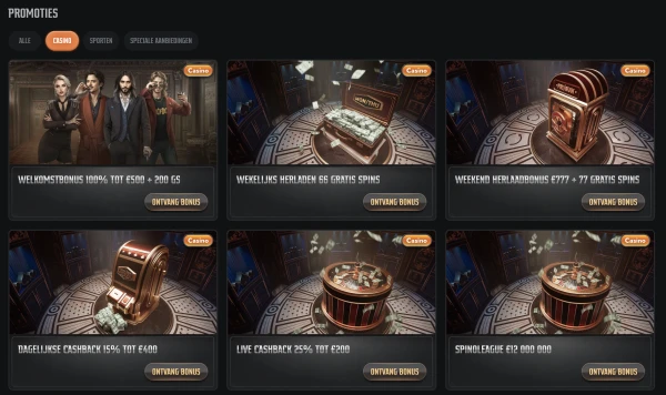 We draaien promoties die passen bij verschillende speelstijlen, van korte sessies tot langere weekendactiviteit. Onze Wekelijkse Reload geeft 50 Free Spins op de eerste storting van de week van maandag tot en met donderdag, terwijl de Weekend Reload 50% tot €700 plus 50 Free Spins biedt. Spelers die liever constante waarde hebben, kiezen vaak voor Wekelijkse Cashback, vastgesteld op 15% tot €3.000.