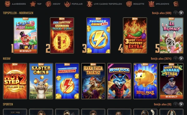 Onze lobby is gebouwd rond keuze en snel filteren, en we bieden circa 8.000 games in veel categorieën. Je vindt content van Pragmatic Play, Play’n GO, Evolution Gaming, NetEnt, Playtech, Quickspin en meer, waaronder Spinomenal, Red Tiger Gaming, Games Global en ELA Games. Omdat sorteren op RTP niet beschikbaar is, raden we aan providerfilters en de spelregelschermen te gebruiken om elke titel te begrijpen voordat je speelt.